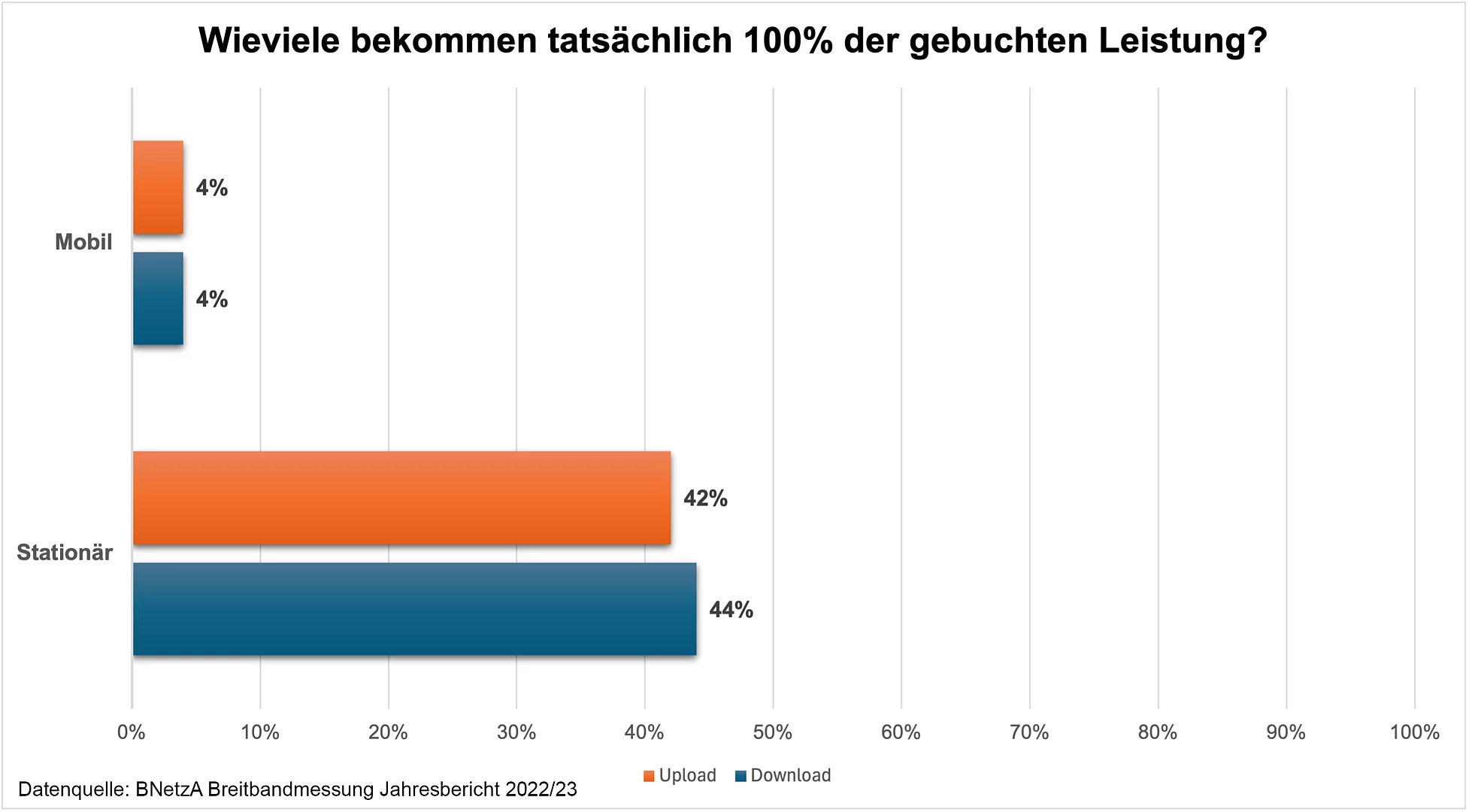 Im Bereich der stationären Breitbandanschlüsse sieht es besser aus: 42% der Nutzer erhalten die volle Leistung im Upload und 44% im Download. Aber auch hier zahlen die Menschen den vollen Preis für weniger als die Hälfte der Leistung. Immerhin: 85,5% bekommen mindestens die Hälfte.