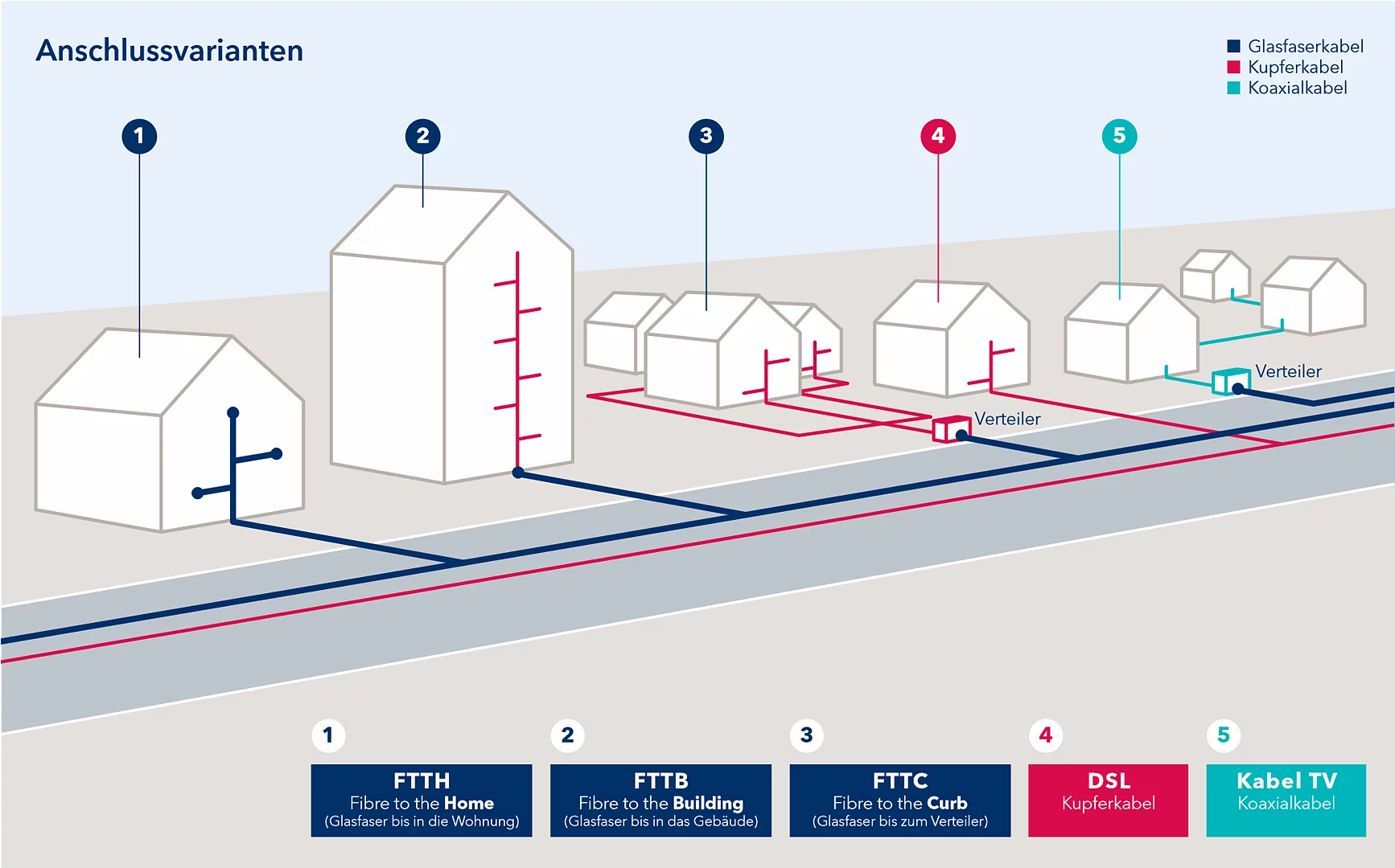 Bundesweit erfolgen aktuell noch die meisten Internetzugänge über den Festnetzanschluss, also einen einfachen Kupferdraht, der ursprünglich nur für das Telefonieren gedacht war. Bei diesem verlangsamt sich die Datenübertragung, wenn das Haus weiter vom Verteiler entfernt ist oder die Leitung von mehreren Parteien genutzt wird. Eine stabile Bandbreite kann hier nicht garantiert werden, deshalb heißt es z.B. „bis zu” 100 Mbit/s.
